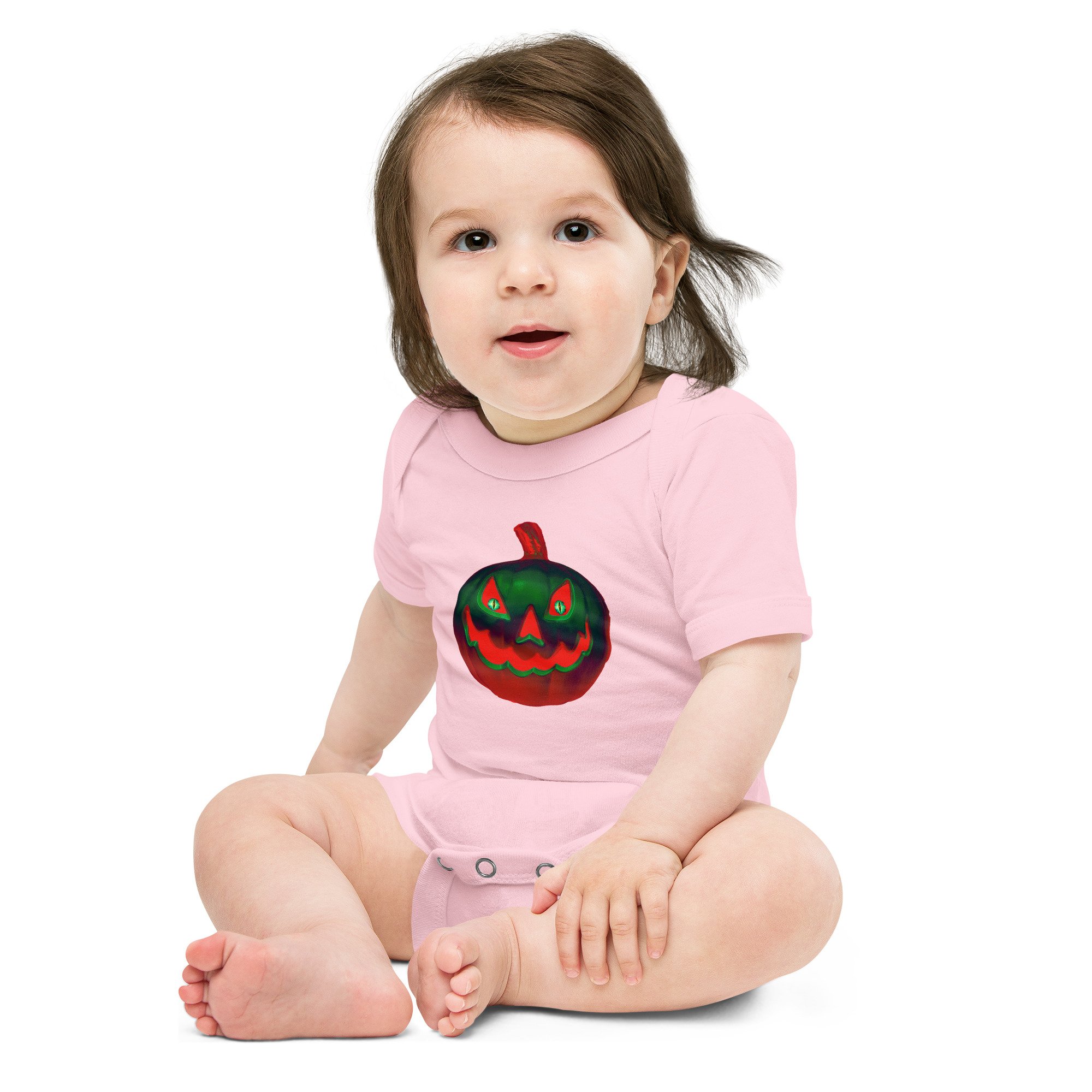 This Jack O Lantern gives all the creepy jitters with its unsettling gaze that glows in retro orange and green. This frightening look will scare off any ghouls or evil spirits coming after your baby! Protect your baby at all cost and use this onesie to save the innocent and while you're saving your babe grab a few other products with one of our exclusive Jack O Lantern designs for you and the rest of your family!!
