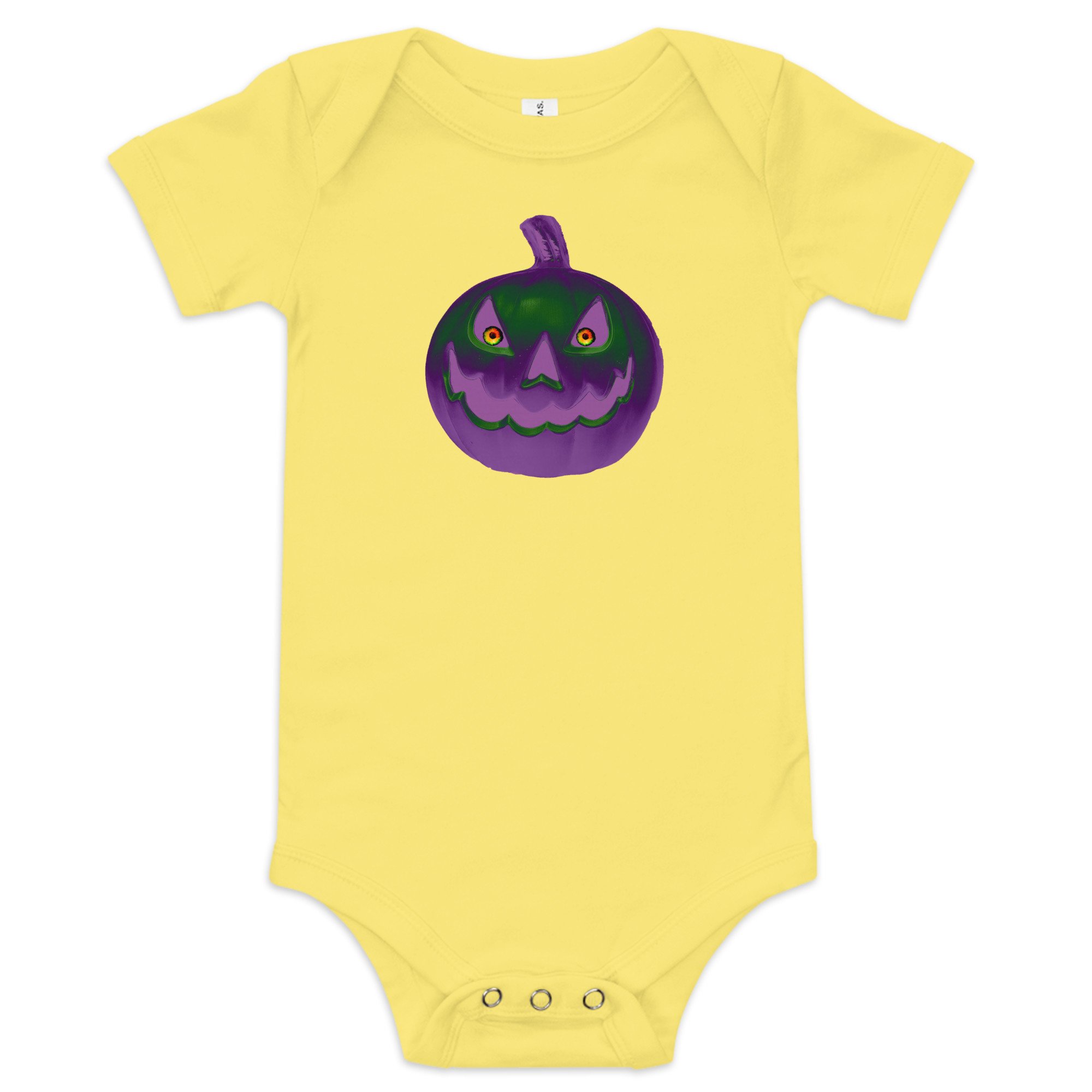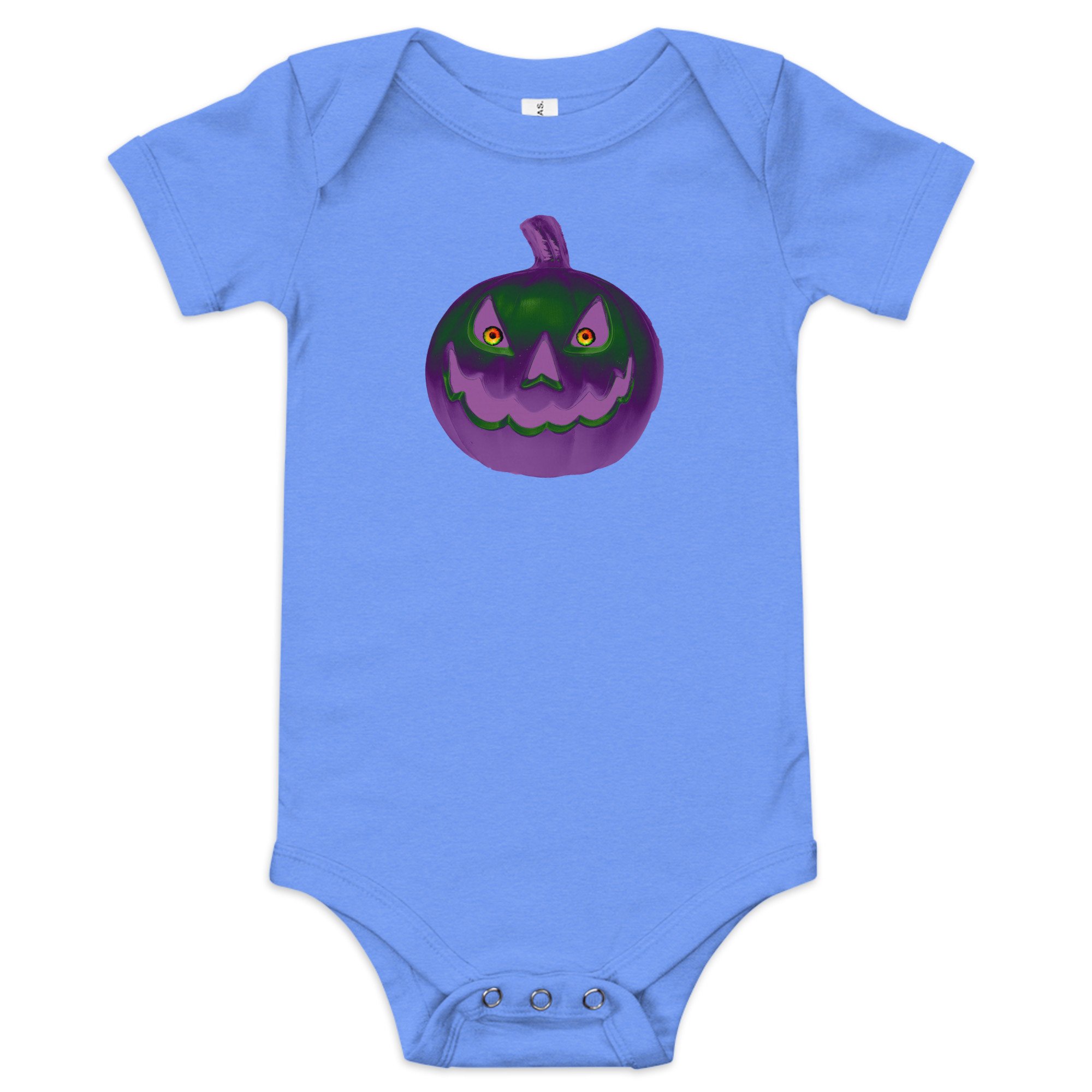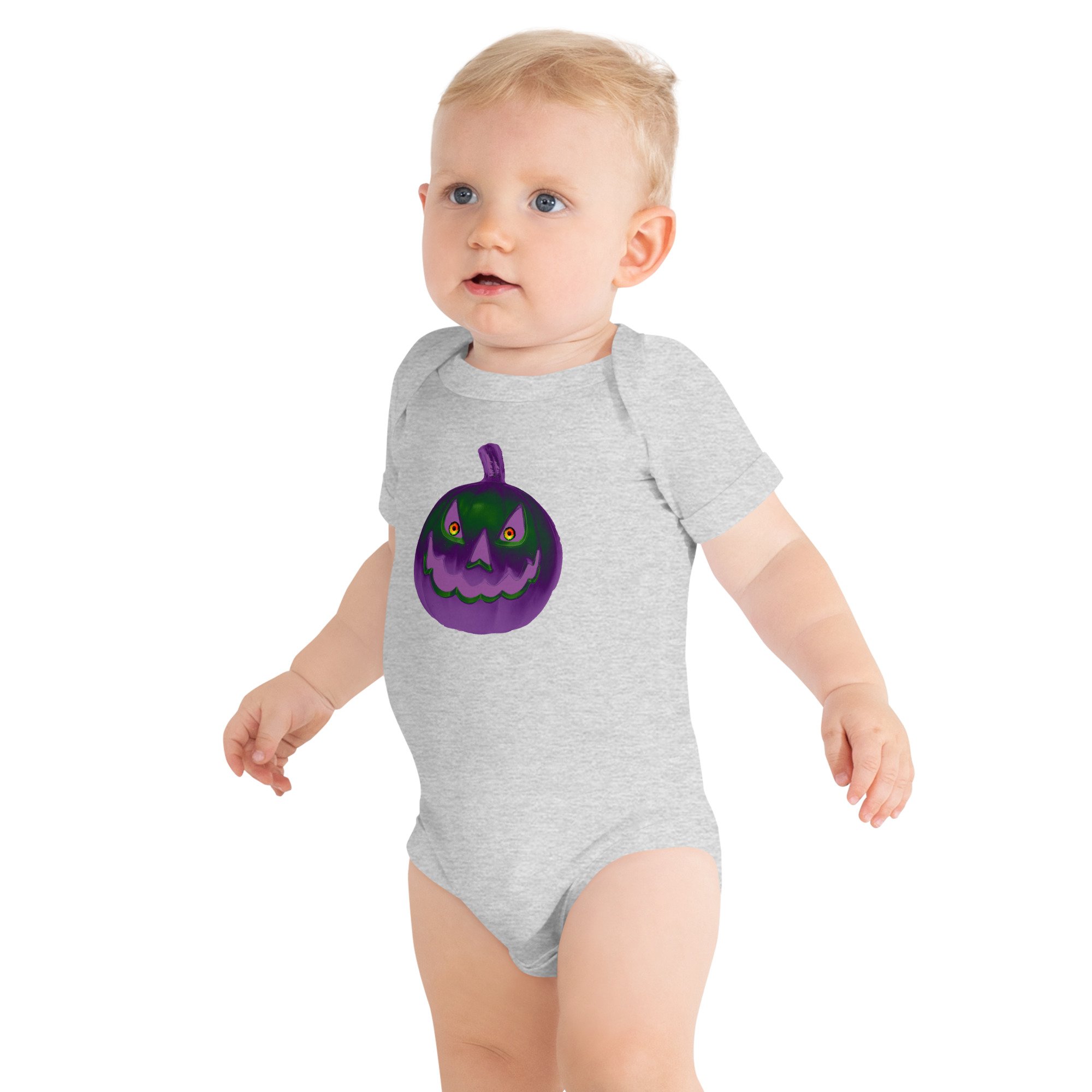 This Jack O Lantern gives all the creepy jitters with its unsettling gaze that glows in retro purple and green. This frightening look will scare off any ghouls or evil spirits coming after your baby! Protect your baby at all cost and use this onesie to save the innocent and while you're saving your babe grab a few other products with one of our exclusive Jack O Lantern designs for you and the rest of your family!!
