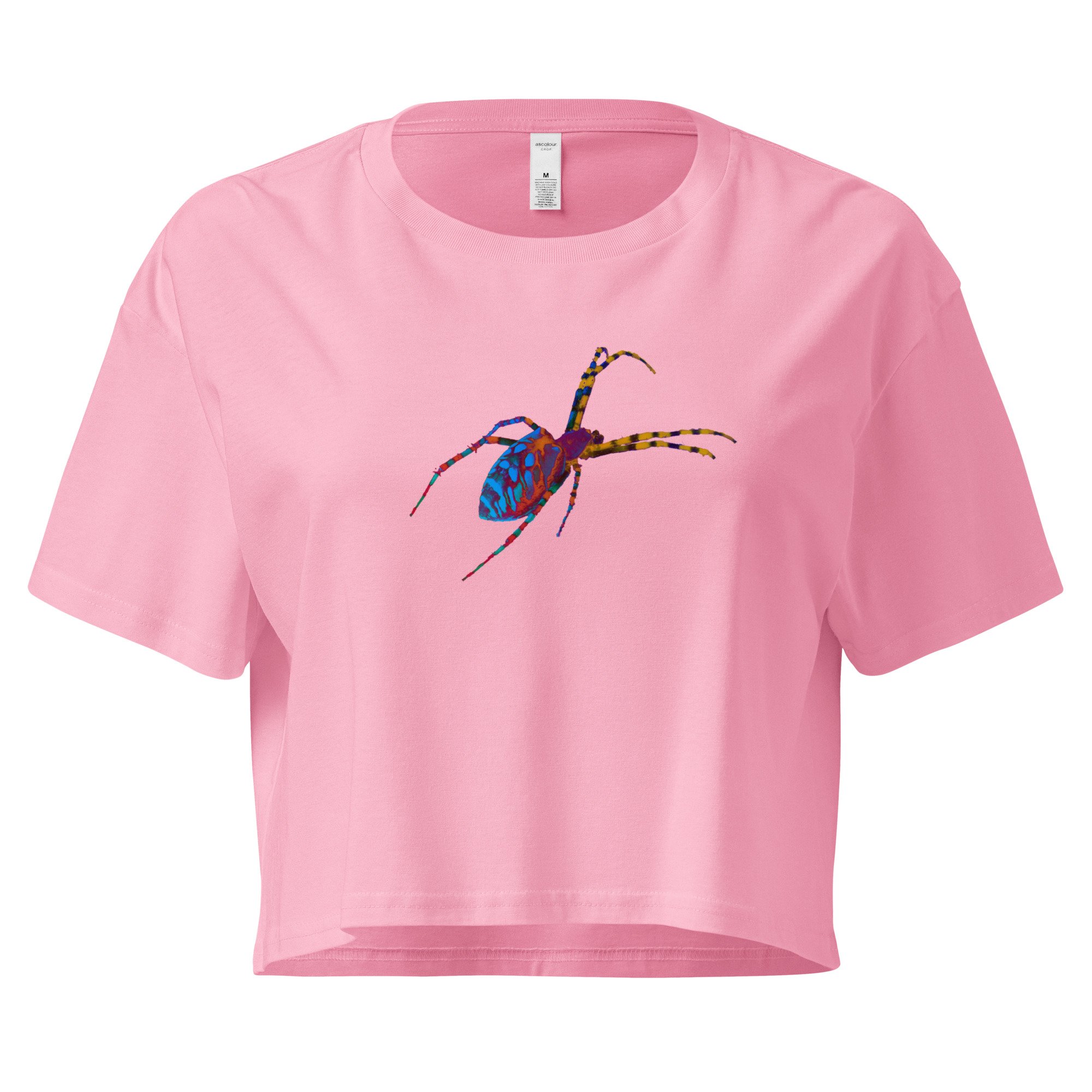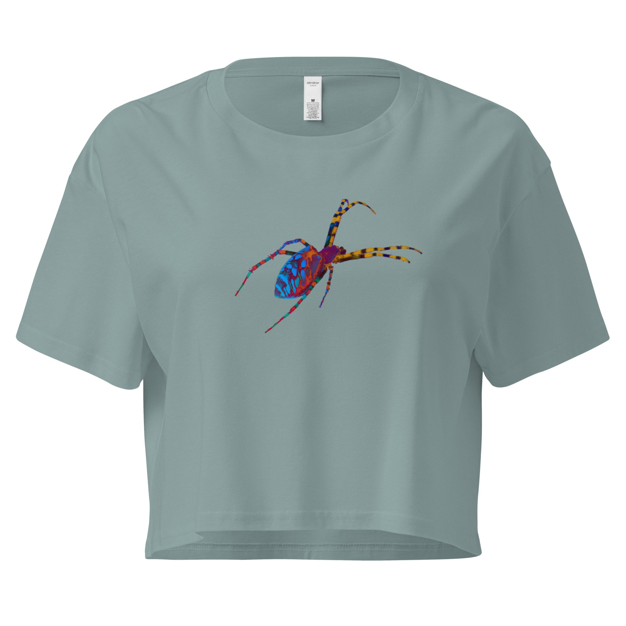 I created this using an actual photo of a Florida garden spider I took randomly outside my house. Through digital painting I added a surrealistic pop of colors. This crop tee shirt is a real conversation piece!