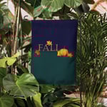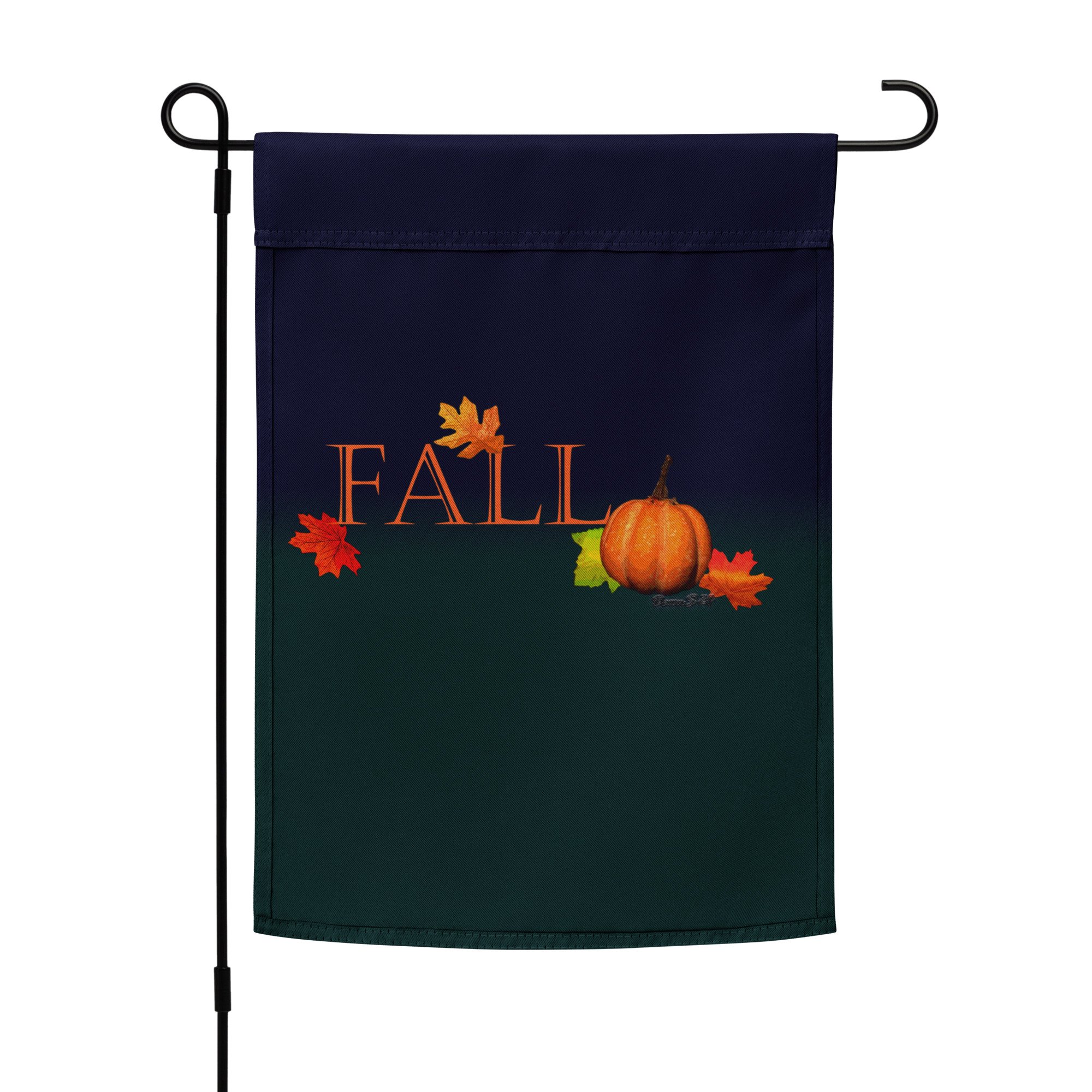 Celebrate your love for the Fall Season with this garden flag! I just love the fall season early evenings with the air so crisp and I created this design with my favorite fall colored leaves and a pumpkin with a gradient navy blue and dark green background.
