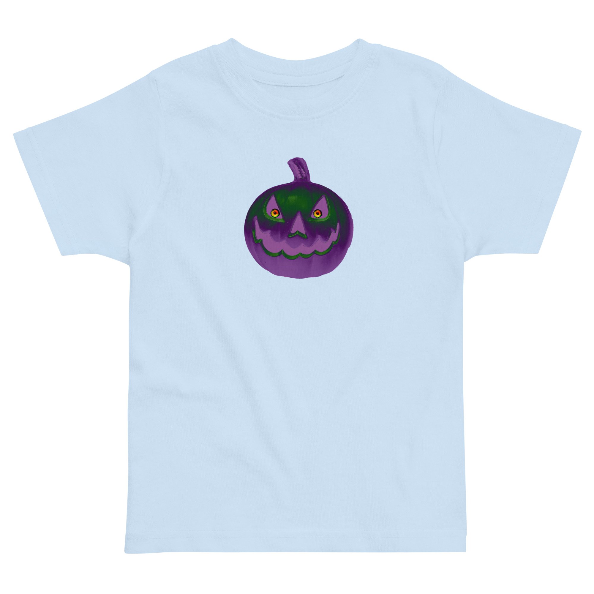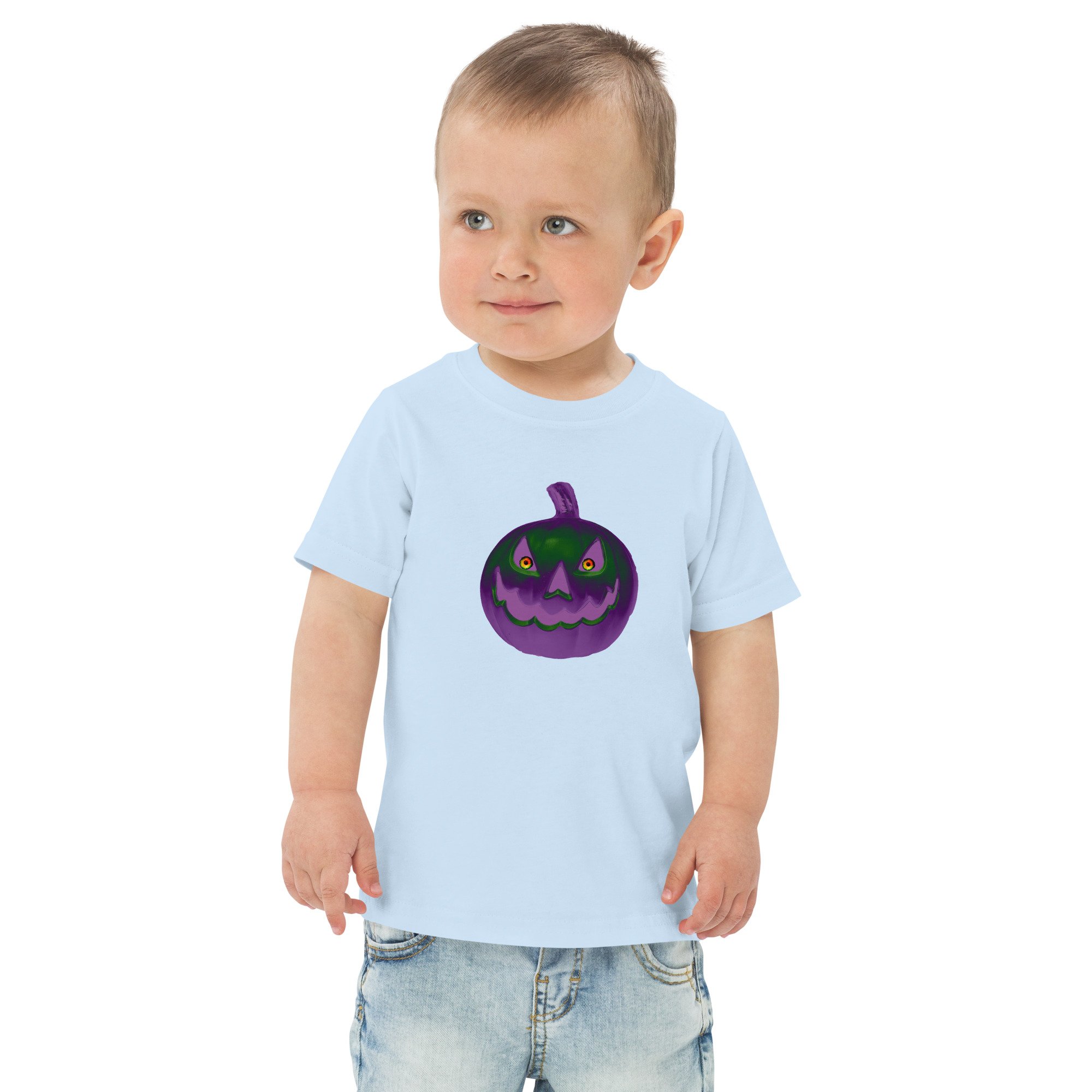 This Jack O Lantern gives all the creepy jitters with its unsettling gaze that glows in retro purple and green. This frightening look will scare off any ghouls or evil spirits coming after your baby! Protect your baby at all cost and use this baby T-shirt to save the innocent and while you're saving your babe grab a few other products with one of our exclusive Jack O Lantern designs for you and the rest of your family!!